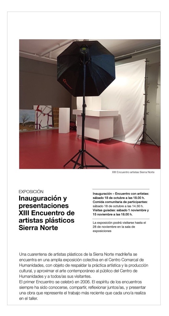 Una cincuentena de artistas plásticos de la Sierra Norte madrileña se encontrará en una amplia exposición colectiva en el Centro Comarcal de Humanidades Sierra Norte, con objeto de respaldar la práctica artística y la producción cultural, y aproximar el arte contemporáneo al público usuario del Centro de Humanidades y a todos sus visitantes.